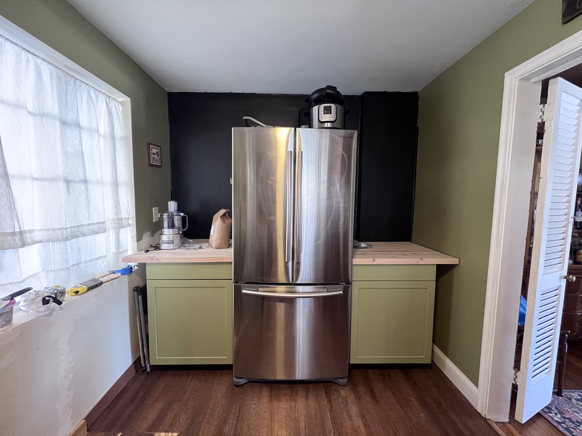 I’m currently in the middle of the next project where I’m taking apart my kitchen. There was originally one long counter with an awkward gap underneath between two cabinets. This caused the fridge to be shoved to the side in an awkward place that didn’t lead to a very pleasing interior space. We found cabinets marked down from $100 to $25 at Lowe’s and while they’re not the most robust cabinetry, they were easy to build, easy to paint and look really nice in the space on either side of the fridge. I normally stray away from symmetry in my own art but in interior design it seems to be a really safe bet.